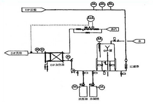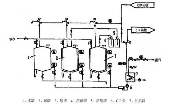 (2)該系統是由CIP罐、CIP泵、回流泵、清洗劑泵、換熱器和管路組成。但沒有大容量的稀釋貯桶。